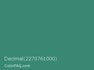 Decimal 2270761000 Color is a normal cyan color and the nearest color is Illuminating Emerald #319177. Hex code #388874 and RGB value is rgb(56,136,116). In RGB color space, this color is composed of 22% red, 53% green, 45% blue, In CMYK color space, this color is composed of 59% cyan, 0% magenta, 15% yellow , 47% black , In HSL color space, this color has a hue angle of 165° , 42% saturation and 38% lightness.