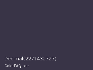 Decimal 2271432725 Color is a dark indigo color and the nearest color is Tuna #353542. Hex code #393447 and RGB value is rgb(57,52,71). In RGB color space, this color is composed of 22% red, 20% green, 28% blue, In CMYK color space, this color is composed of 20% cyan, 27% magenta, 0% yellow , 72% black , In HSL color space, this color has a hue angle of 256° , 15% saturation and 24% lightness.
