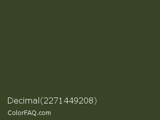 Decimal 2271449208 Color is a very dark green color and the nearest color is Kombu Green #354230. Hex code #394426 and RGB value is rgb(57,68,38). In RGB color space, this color is composed of 22% red, 27% green, 15% blue, In CMYK color space, this color is composed of 16% cyan, 0% magenta, 44% yellow , 73% black , In HSL color space, this color has a hue angle of 82° , 28% saturation and 21% lightness.
