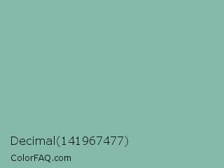 Decimal 141967477 Color is a light green color and the nearest color is Gulf Stream #80b3ae. Hex code #85baab and RGB value is rgb(133,186,171). In RGB color space, this color is composed of 52% red, 73% green, 67% blue, In CMYK color space, this color is composed of 28% cyan, 0% magenta, 8% yellow , 27% black , In HSL color space, this color has a hue angle of 163° , 28% saturation and 63% lightness.