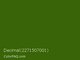 Decimal 2271507001 Color is a very dark green color and the nearest color is Dell #396413. Hex code #396407 and RGB value is rgb(57,100,7). In RGB color space, this color is composed of 22% red, 39% green, 3% blue, In CMYK color space, this color is composed of 43% cyan, 0% magenta, 93% yellow , 61% black , In HSL color space, this color has a hue angle of 88° , 87% saturation and 21% lightness.