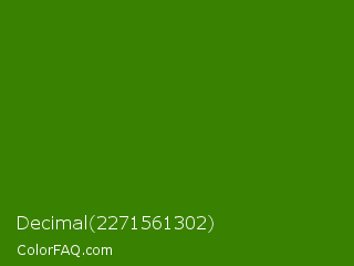 Decimal 2271561302 Color is a dark green color and the nearest color is Napier Green #2a8000. Hex code #398100 and RGB value is rgb(57,129,0). In RGB color space, this color is composed of 22% red, 51% green, 0% blue, In CMYK color space, this color is composed of 56% cyan, 0% magenta, 100% yellow , 49% black , In HSL color space, this color has a hue angle of 93° , 100% saturation and 25% lightness.