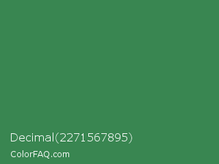 Decimal 2271567895 Color is a normal green color and the nearest color is Goblin #3d7d52. Hex code #398651 and RGB value is rgb(57,134,81). In RGB color space, this color is composed of 22% red, 53% green, 32% blue, In CMYK color space, this color is composed of 57% cyan, 0% magenta, 40% yellow , 47% black , In HSL color space, this color has a hue angle of 139° , 40% saturation and 37% lightness.