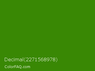 Decimal 2271568978 Color is a dark green color and the nearest color is Napier Green #2a8000. Hex code #398804 and RGB value is rgb(57,136,4). In RGB color space, this color is composed of 22% red, 53% green, 2% blue, In CMYK color space, this color is composed of 58% cyan, 0% magenta, 97% yellow , 47% black , In HSL color space, this color has a hue angle of 96° , 94% saturation and 27% lightness.
