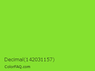 Decimal 142031157 Color is a normal green color and the nearest color is Kiwi #8ee53f. Hex code #85e12f and RGB value is rgb(133,225,47). In RGB color space, this color is composed of 52% red, 88% green, 18% blue, In CMYK color space, this color is composed of 41% cyan, 0% magenta, 79% yellow , 12% black , In HSL color space, this color has a hue angle of 91° , 75% saturation and 53% lightness.