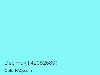 Decimal 142082689 Color is a light cyan color and the nearest color is Electric Blue #7df9ff. Hex code #85f9f9 and RGB value is rgb(133,249,249). In RGB color space, this color is composed of 52% red, 98% green, 98% blue, In CMYK color space, this color is composed of 47% cyan, 0% magenta, 0% yellow , 2% black , In HSL color space, this color has a hue angle of 180° , 91% saturation and 75% lightness.