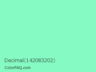 Decimal 142083202 Color is a light green color and the nearest color is Aquamarine #7fffd4. Hex code #85fac2 and RGB value is rgb(133,250,194). In RGB color space, this color is composed of 52% red, 98% green, 76% blue, In CMYK color space, this color is composed of 47% cyan, 0% magenta, 22% yellow , 2% black , In HSL color space, this color has a hue angle of 151° , 92% saturation and 75% lightness.