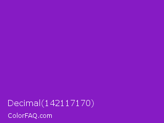 Decimal 142117170 Color is a normal purple color and the nearest color is French Violet #8806ce. Hex code #861bc4 and RGB value is rgb(134,27,196). In RGB color space, this color is composed of 53% red, 11% green, 77% blue, In CMYK color space, this color is composed of 32% cyan, 86% magenta, 0% yellow , 23% black , In HSL color space, this color has a hue angle of 278° , 76% saturation and 44% lightness.