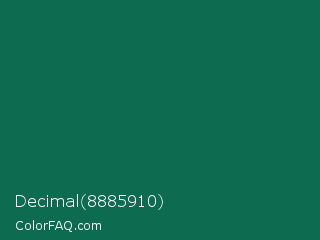 Decimal 8885910 Color is a dark green color and the nearest color is Watercourse #056f57. Hex code #0d6c50 and RGB value is rgb(13,108,80). In RGB color space, this color is composed of 5% red, 42% green, 31% blue, In CMYK color space, this color is composed of 88% cyan, 0% magenta, 26% yellow , 58% black , In HSL color space, this color has a hue angle of 162° , 79% saturation and 24% lightness.