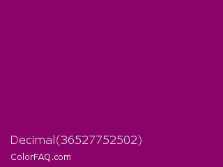 Decimal 36527752502 Color is a dark magenta color and the nearest color is Cardinal Pink #8c055e. Hex code #890368 and RGB value is rgb(137,3,104). In RGB color space, this color is composed of 54% red, 1% green, 41% blue, In CMYK color space, this color is composed of 0% cyan, 98% magenta, 24% yellow , 46% black , In HSL color space, this color has a hue angle of 315° , 96% saturation and 27% lightness.