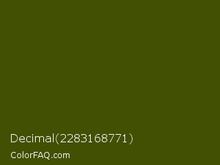 Decimal 2283168771 Color is a very dark lime color and the nearest color is Verdun Green #495400. Hex code #415003 and RGB value is rgb(65,80,3). In RGB color space, this color is composed of 25% red, 31% green, 1% blue, In CMYK color space, this color is composed of 19% cyan, 0% magenta, 96% yellow , 69% black , In HSL color space, this color has a hue angle of 72° , 93% saturation and 16% lightness.