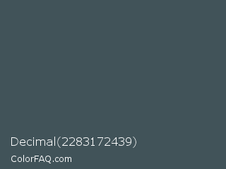 Decimal 2283172439 Color is a dark blue color and the nearest color is River Bed #434c59. Hex code #415359 and RGB value is rgb(65,83,89). In RGB color space, this color is composed of 25% red, 33% green, 35% blue, In CMYK color space, this color is composed of 27% cyan, 7% magenta, 0% yellow , 65% black , In HSL color space, this color has a hue angle of 195° , 16% saturation and 30% lightness.