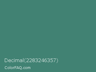 Decimal 2283246357 Color is a normal cyan color and the nearest color is Viridian #40826d. Hex code #418273 and RGB value is rgb(65,130,115). In RGB color space, this color is composed of 25% red, 51% green, 45% blue, In CMYK color space, this color is composed of 50% cyan, 0% magenta, 12% yellow , 49% black , In HSL color space, this color has a hue angle of 166° , 33% saturation and 38% lightness.