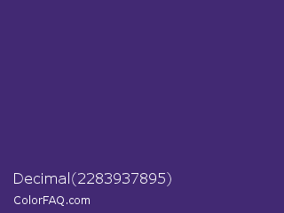 Decimal 2283937895 Color is a normal indigo color and the nearest color is Meteorite #3c1f76. Hex code #422973 and RGB value is rgb(66,41,115). In RGB color space, this color is composed of 26% red, 16% green, 45% blue, In CMYK color space, this color is composed of 43% cyan, 64% magenta, 0% yellow , 55% black , In HSL color space, this color has a hue angle of 260° , 47% saturation and 31% lightness.