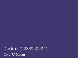 Decimal 2283950994 Color is a normal indigo color and the nearest color is Jacarta #3a2a6a. Hex code #423670 and RGB value is rgb(66,54,112). In RGB color space, this color is composed of 26% red, 21% green, 44% blue, In CMYK color space, this color is composed of 41% cyan, 52% magenta, 0% yellow , 56% black , In HSL color space, this color has a hue angle of 252° , 35% saturation and 33% lightness.