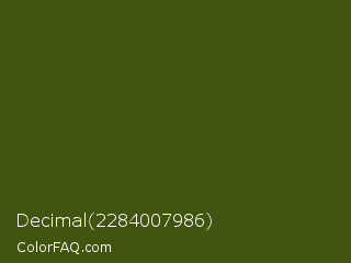Decimal 2284007986 Color is a very dark lime color and the nearest color is Clover #384910. Hex code #425510 and RGB value is rgb(66,85,16). In RGB color space, this color is composed of 26% red, 33% green, 6% blue, In CMYK color space, this color is composed of 22% cyan, 0% magenta, 81% yellow , 67% black , In HSL color space, this color has a hue angle of 77° , 68% saturation and 20% lightness.