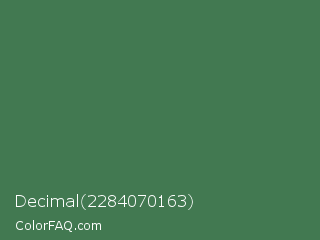 Decimal 2284070163 Color is a normal green color and the nearest color is Goblin #3d7d52. Hex code #427951 and RGB value is rgb(66,121,81). In RGB color space, this color is composed of 26% red, 47% green, 32% blue, In CMYK color space, this color is composed of 45% cyan, 0% magenta, 33% yellow , 53% black , In HSL color space, this color has a hue angle of 136° , 29% saturation and 37% lightness.