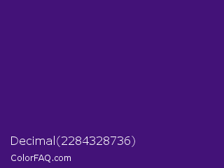 Decimal 2284328736 Color is a dark violet color and the nearest color is Windsor #3c0878. Hex code #431278 and RGB value is rgb(67,18,120). In RGB color space, this color is composed of 26% red, 7% green, 47% blue, In CMYK color space, this color is composed of 44% cyan, 85% magenta, 0% yellow , 53% black , In HSL color space, this color has a hue angle of 269° , 74% saturation and 27% lightness.