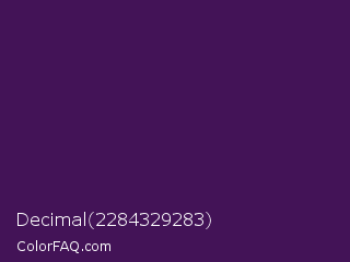 Decimal 2284329283 Color is a very dark purple color and the nearest color is Scarlet Gum #431560. Hex code #431357 and RGB value is rgb(67,19,87). In RGB color space, this color is composed of 26% red, 7% green, 34% blue, In CMYK color space, this color is composed of 23% cyan, 78% magenta, 0% yellow , 66% black , In HSL color space, this color has a hue angle of 282° , 64% saturation and 21% lightness.