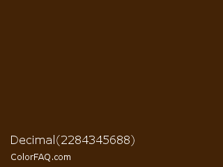 Decimal 2284345688 Color is a very dark orange color and the nearest color is Bronze Pantone #3f2109. Hex code #432306 and RGB value is rgb(67,35,6). In RGB color space, this color is composed of 26% red, 14% green, 2% blue, In CMYK color space, this color is composed of 0% cyan, 48% magenta, 91% yellow , 74% black , In HSL color space, this color has a hue angle of 29° , 84% saturation and 14% lightness.