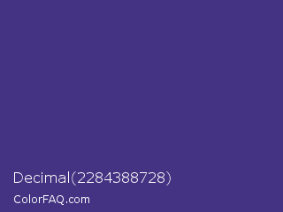 Decimal 2284388728 Color is a normal indigo color and the nearest color is Minsk #3f307f. Hex code #433382 and RGB value is rgb(67,51,130). In RGB color space, this color is composed of 26% red, 20% green, 51% blue, In CMYK color space, this color is composed of 48% cyan, 61% magenta, 0% yellow , 49% black , In HSL color space, this color has a hue angle of 252° , 44% saturation and 35% lightness.