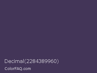 Decimal 2284389960 Color is a dark violet color and the nearest color is Gun Powder #414257. Hex code #433558 and RGB value is rgb(67,53,88). In RGB color space, this color is composed of 26% red, 21% green, 35% blue, In CMYK color space, this color is composed of 24% cyan, 40% magenta, 0% yellow , 65% black , In HSL color space, this color has a hue angle of 264° , 25% saturation and 28% lightness.