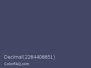 Decimal 2284408851 Color is a normal blue color and the nearest color is Mulled Wine #4e4562. Hex code #434665 and RGB value is rgb(67,70,101). In RGB color space, this color is composed of 26% red, 27% green, 40% blue, In CMYK color space, this color is composed of 34% cyan, 31% magenta, 0% yellow , 60% black , In HSL color space, this color has a hue angle of 235° , 20% saturation and 33% lightness.