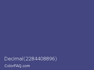 Decimal 2284408896 Color is a normal blue color and the nearest color is East Bay #414c7d. Hex code #434680 and RGB value is rgb(67,70,128). In RGB color space, this color is composed of 26% red, 27% green, 50% blue, In CMYK color space, this color is composed of 48% cyan, 45% magenta, 0% yellow , 50% black , In HSL color space, this color has a hue angle of 237° , 31% saturation and 38% lightness.