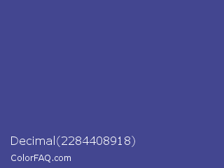 Decimal 2284408918 Color is a normal blue color and the nearest color is Dark Slate Blue #483d8b. Hex code #434690 and RGB value is rgb(67,70,144). In RGB color space, this color is composed of 26% red, 27% green, 56% blue, In CMYK color space, this color is composed of 53% cyan, 51% magenta, 0% yellow , 44% black , In HSL color space, this color has a hue angle of 238° , 36% saturation and 41% lightness.