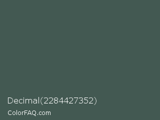 Decimal 2284427352 Color is a normal green color and the nearest color is Mineral Green #3f5d53. Hex code #435952 and RGB value is rgb(67,89,82). In RGB color space, this color is composed of 26% red, 35% green, 32% blue, In CMYK color space, this color is composed of 25% cyan, 0% magenta, 8% yellow , 65% black , In HSL color space, this color has a hue angle of 161° , 14% saturation and 31% lightness.