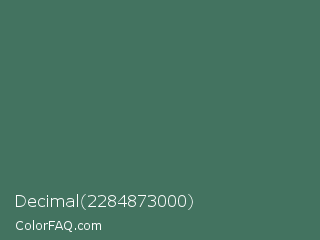 Decimal 2284873000 Color is a normal green color and the nearest color is Hookers Green #49796b. Hex code #437360 and RGB value is rgb(67,115,96). In RGB color space, this color is composed of 26% red, 45% green, 38% blue, In CMYK color space, this color is composed of 42% cyan, 0% magenta, 17% yellow , 55% black , In HSL color space, this color has a hue angle of 156° , 26% saturation and 36% lightness.