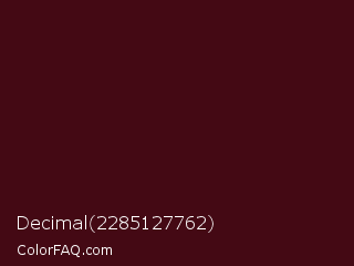 Decimal 2285127762 Color is a very dark red color and the nearest color is Aubergine #3b0910. Hex code #440914 and RGB value is rgb(68,9,20). In RGB color space, this color is composed of 27% red, 4% green, 8% blue, In CMYK color space, this color is composed of 0% cyan, 87% magenta, 71% yellow , 73% black , In HSL color space, this color has a hue angle of 349° , 77% saturation and 15% lightness.