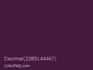 Decimal 2285144467 Color is a very dark magenta color and the nearest color is Loulou #460b41. Hex code #441941 and RGB value is rgb(68,25,65). In RGB color space, this color is composed of 27% red, 10% green, 25% blue, In CMYK color space, this color is composed of 0% cyan, 63% magenta, 4% yellow , 73% black , In HSL color space, this color has a hue angle of 304° , 46% saturation and 18% lightness.