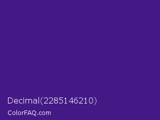 Decimal 2285146210 Color is a normal violet color and the nearest color is Pixie Powder #391285. Hex code #441986 and RGB value is rgb(68,25,134). In RGB color space, this color is composed of 27% red, 10% green, 53% blue, In CMYK color space, this color is composed of 49% cyan, 81% magenta, 0% yellow , 47% black , In HSL color space, this color has a hue angle of 264° , 69% saturation and 31% lightness.