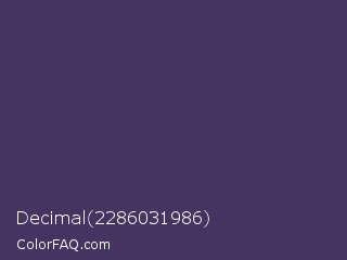 Decimal 2286031986 Color is a dark violet color and the nearest color is Bossanova #4e2a5a. Hex code #453460 and RGB value is rgb(69,52,96). In RGB color space, this color is composed of 27% red, 20% green, 38% blue, In CMYK color space, this color is composed of 28% cyan, 46% magenta, 0% yellow , 62% black , In HSL color space, this color has a hue angle of 263° , 30% saturation and 29% lightness.