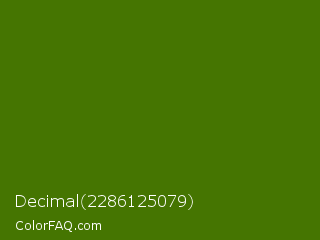 Decimal 2286125079 Color is a dark green color and the nearest color is Green Leaf #436a0d. Hex code #457501 and RGB value is rgb(69,117,1). In RGB color space, this color is composed of 27% red, 46% green, 0% blue, In CMYK color space, this color is composed of 41% cyan, 0% magenta, 99% yellow , 54% black , In HSL color space, this color has a hue angle of 85° , 98% saturation and 23% lightness.