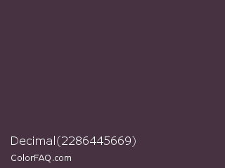 Decimal 2286445669 Color is a dark magenta color and the nearest color is Ship Gray #3e3a44. Hex code #463241 and RGB value is rgb(70,50,65). In RGB color space, this color is composed of 27% red, 20% green, 25% blue, In CMYK color space, this color is composed of 0% cyan, 29% magenta, 7% yellow , 73% black , In HSL color space, this color has a hue angle of 315° , 17% saturation and 24% lightness.