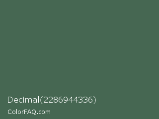 Decimal 2286944336 Color is a normal green color and the nearest color is Nandor #4b5d52. Hex code #466752 and RGB value is rgb(70,103,82). In RGB color space, this color is composed of 27% red, 40% green, 32% blue, In CMYK color space, this color is composed of 32% cyan, 0% magenta, 20% yellow , 60% black , In HSL color space, this color has a hue angle of 142° , 19% saturation and 34% lightness.