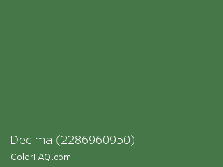 Decimal 2286960950 Color is a normal green color and the nearest color is Fern Green #4f7942. Hex code #467748 and RGB value is rgb(70,119,72). In RGB color space, this color is composed of 27% red, 47% green, 28% blue, In CMYK color space, this color is composed of 41% cyan, 0% magenta, 39% yellow , 53% black , In HSL color space, this color has a hue angle of 122° , 26% saturation and 37% lightness.