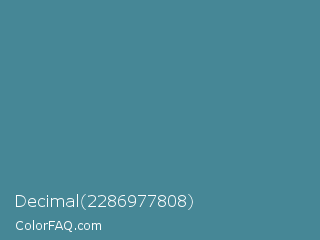 Decimal 2286977808 Color is a normal cyan color and the nearest color is Wedgewood #4e7f9e. Hex code #468796 and RGB value is rgb(70,135,150). In RGB color space, this color is composed of 27% red, 53% green, 59% blue, In CMYK color space, this color is composed of 53% cyan, 10% magenta, 0% yellow , 41% black , In HSL color space, this color has a hue angle of 191° , 36% saturation and 43% lightness.