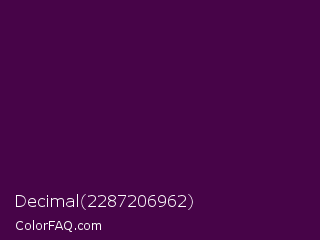 Decimal 2287206962 Color is a very dark magenta color and the nearest color is Loulou #460b41. Hex code #470448 and RGB value is rgb(71,4,72). In RGB color space, this color is composed of 28% red, 2% green, 28% blue, In CMYK color space, this color is composed of 1% cyan, 94% magenta, 0% yellow , 72% black , In HSL color space, this color has a hue angle of 299° , 89% saturation and 15% lightness.