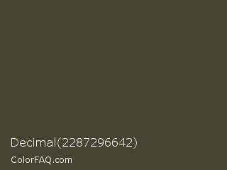 Decimal 2287296642 Color is a dark yellow color and the nearest color is Taupe #483c32. Hex code #474232 and RGB value is rgb(71,66,50). In RGB color space, this color is composed of 28% red, 26% green, 20% blue, In CMYK color space, this color is composed of 0% cyan, 7% magenta, 30% yellow , 72% black , In HSL color space, this color has a hue angle of 46° , 17% saturation and 24% lightness.