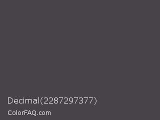 Decimal 2287297377 Color is a dark purple color and the nearest color is Gravel #4a444b. Hex code #474349 and RGB value is rgb(71,67,73). In RGB color space, this color is composed of 28% red, 26% green, 29% blue, In CMYK color space, this color is composed of 3% cyan, 8% magenta, 0% yellow , 71% black , In HSL color space, this color has a hue angle of 280° , 4% saturation and 27% lightness.