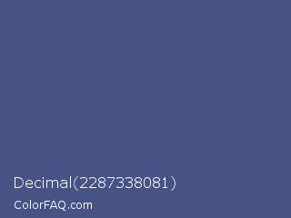 Decimal 2287338081 Color is a normal blue color and the nearest color is Purple Navy #4e5180. Hex code #475285 and RGB value is rgb(71,82,133). In RGB color space, this color is composed of 28% red, 32% green, 52% blue, In CMYK color space, this color is composed of 47% cyan, 38% magenta, 0% yellow , 48% black , In HSL color space, this color has a hue angle of 229° , 30% saturation and 40% lightness.