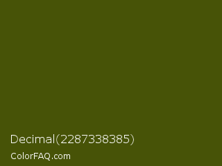 Decimal 2287338385 Color is a very dark yellow color and the nearest color is Verdun Green #495400. Hex code #475307 and RGB value is rgb(71,83,7). In RGB color space, this color is composed of 28% red, 33% green, 3% blue, In CMYK color space, this color is composed of 14% cyan, 0% magenta, 92% yellow , 67% black , In HSL color space, this color has a hue angle of 69° , 84% saturation and 18% lightness.
