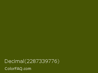 Decimal 2287339776 Color is a very dark yellow color and the nearest color is Verdun Green #495400. Hex code #475504 and RGB value is rgb(71,85,4). In RGB color space, this color is composed of 28% red, 33% green, 2% blue, In CMYK color space, this color is composed of 16% cyan, 0% magenta, 95% yellow , 67% black , In HSL color space, this color has a hue angle of 70° , 91% saturation and 17% lightness.