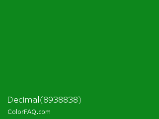 Decimal 8938838 Color is a dark green color and the nearest color is India Green #138808. Hex code #0d871c and RGB value is rgb(13,135,28). In RGB color space, this color is composed of 5% red, 53% green, 11% blue, In CMYK color space, this color is composed of 90% cyan, 0% magenta, 79% yellow , 47% black , In HSL color space, this color has a hue angle of 127° , 82% saturation and 29% lightness.
