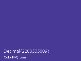 Decimal 2288535889 Color is a normal indigo color and the nearest color is Gigas #523c94. Hex code #493997 and RGB value is rgb(73,57,151). In RGB color space, this color is composed of 29% red, 22% green, 59% blue, In CMYK color space, this color is composed of 52% cyan, 62% magenta, 0% yellow , 41% black , In HSL color space, this color has a hue angle of 250° , 45% saturation and 41% lightness.