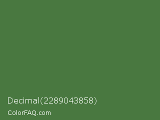 Decimal 2289043858 Color is a normal green color and the nearest color is Fern Green #4f7942. Hex code #497840 and RGB value is rgb(73,120,64). In RGB color space, this color is composed of 29% red, 47% green, 25% blue, In CMYK color space, this color is composed of 39% cyan, 0% magenta, 47% yellow , 53% black , In HSL color space, this color has a hue angle of 110° , 30% saturation and 36% lightness.