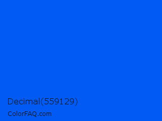 Decimal 559129 Color is a normal blue color and the nearest color is Blue Ribbon #0066ff. Hex code #015af3 and RGB value is rgb(1,90,243). In RGB color space, this color is composed of 0% red, 35% green, 95% blue, In CMYK color space, this color is composed of 100% cyan, 63% magenta, 0% yellow , 5% black , In HSL color space, this color has a hue angle of 218° , 99% saturation and 48% lightness.